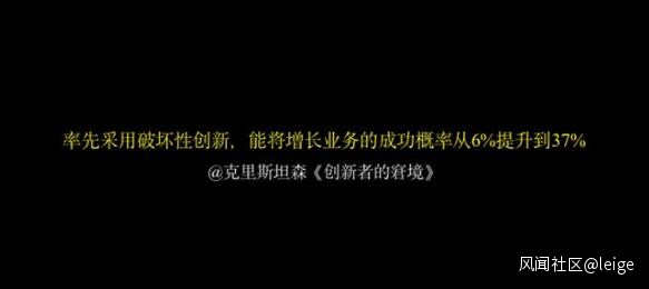 《創新者的窘境》裏,克里斯坦森研究了磁盤驅動器20年的歷史,統計出數據説,如果你正面跟巨頭競爭,成功率只有6%。如果你率先進到一個新興價值網裏面去,採用一種破壞性創新的競爭策略,成功率會高達37%,有6倍的差距。