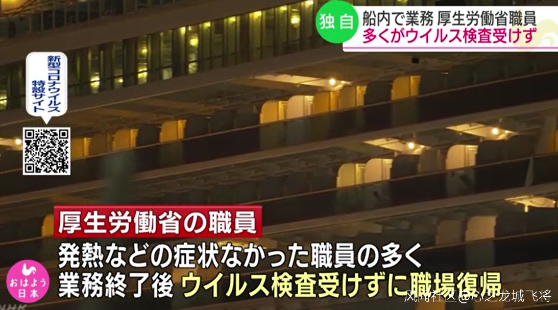 日本厚生勞動省稱,到目前為止,該部門至少有90名工作人員上了船,但沒有出現發熱等症狀的人,大多在任務結束後沒有接受病毒檢查就直接返回了工作崗位。