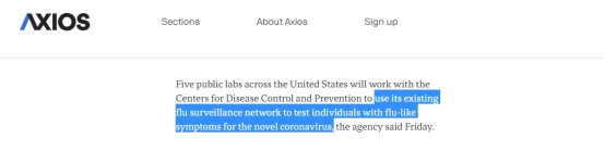 美國Axios新聞網也提到,由於流感症狀和感染新型冠狀病毒的部分症狀是相同的,所以美國疾控中心14日便宣佈,將開始在舊金山、洛杉磯、芝加哥、西雅圖和紐約市的公共衞生實驗室對流感樣症狀患者進行新冠病毒檢測。