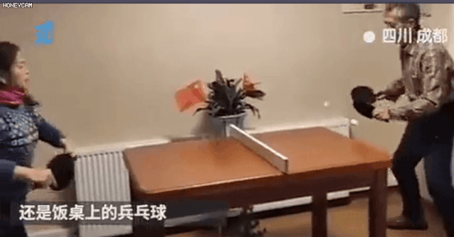 有的在餐桌上擺一條槓,乒乓球比賽就此開始。