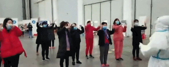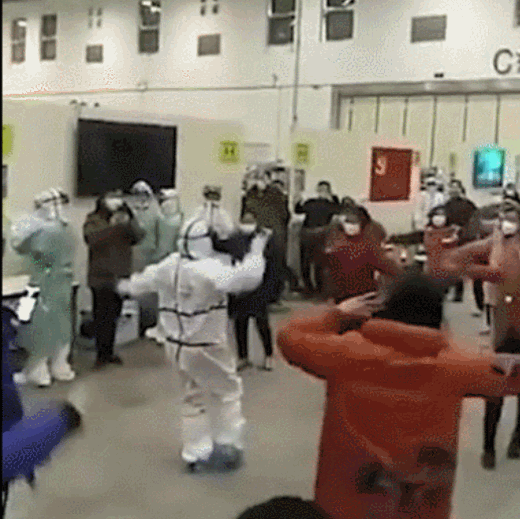 穿着防護服的醫護人員帶頭跳起了舞,周圍,幾十個人穿着拖鞋、睡衣,排列整齊地模仿。