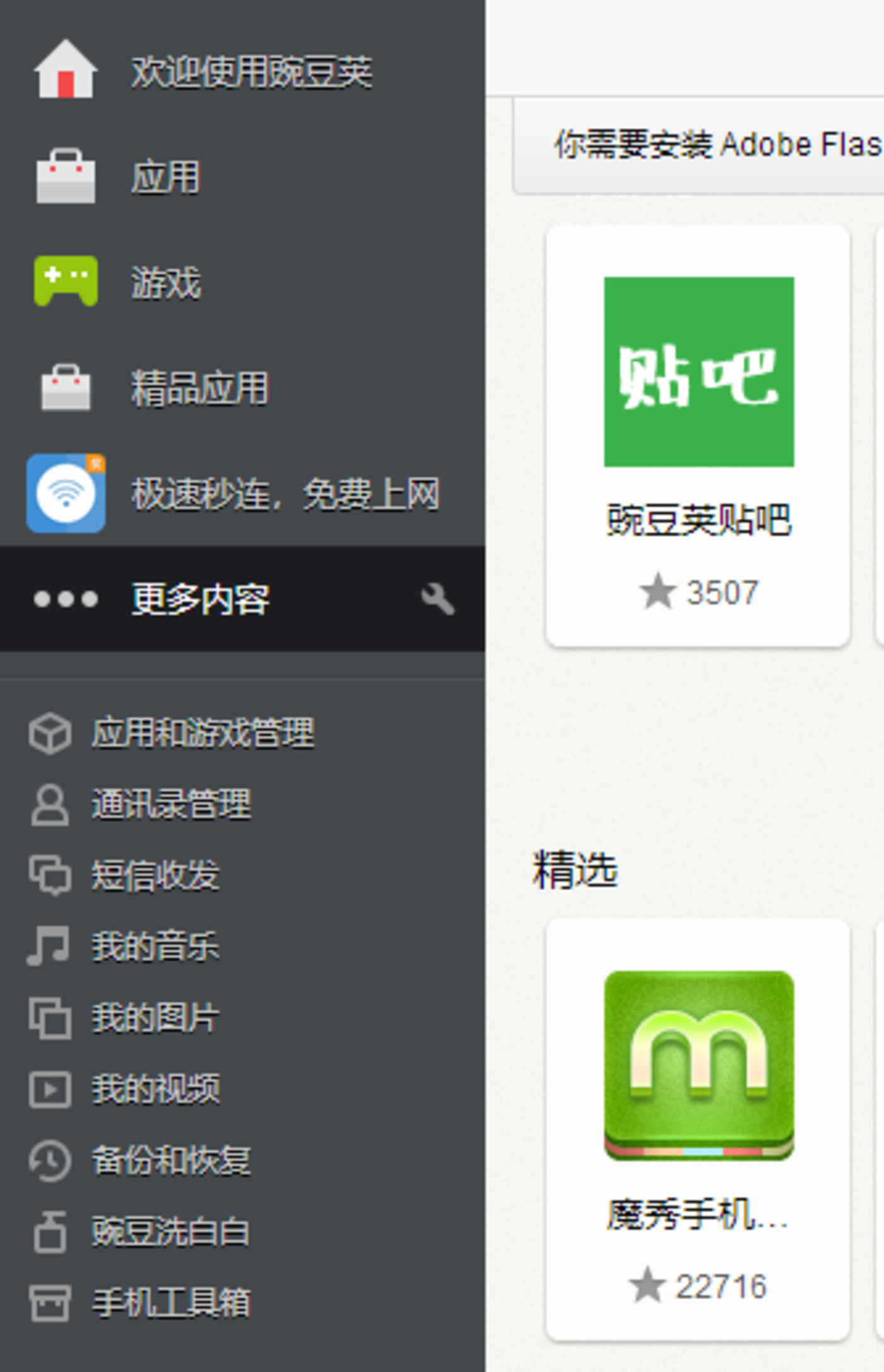 此外,在3/4G網絡普及的早期階段,數據流量價格並不便宜,類似於豌豆莢、91助手等電腦端應用管理工具,也獲得了不少人的青睞。除了應用免流量安裝外,它們還具有文件管理傳輸等更豐富的功能。