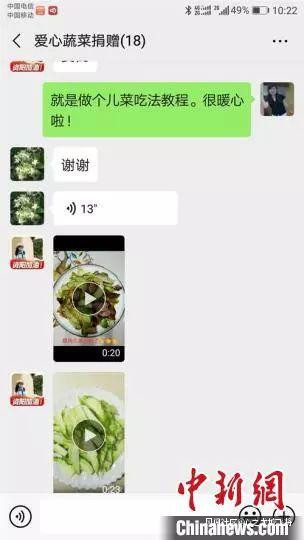 這些視頻教程和建議很快傳到了湖北求助者的微信上,得到了他連聲的感謝!他説:“感謝資陽朋友們的熱情相助,不僅給我們捐來了愛心蔬菜,還教會我們怎麼做菜,你們的大愛精神值得我們永遠銘記!”