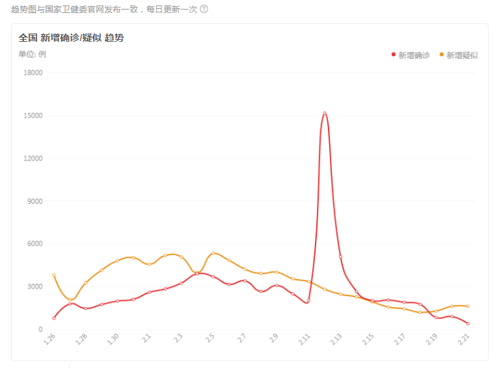 2月21日0—24時,31個省(自治區、直轄市)和新疆生產建設兵團報告新增確診病例397例,新增死亡病例109例(湖北106例,河北、上海和新疆生產建設兵團各1例),新增疑似病例1361例。