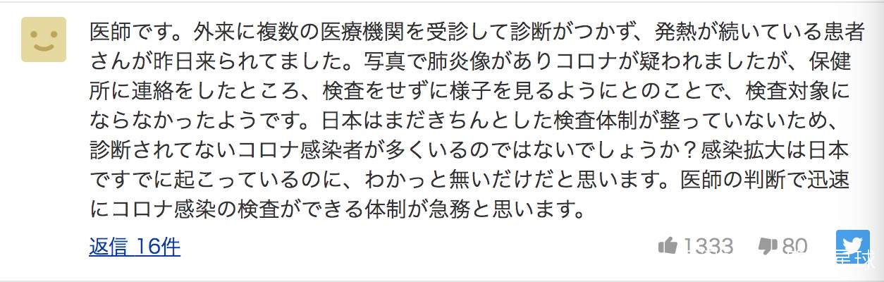 “我是醫生,昨天來了一位疑似患者,他在多家醫院未能確診。從片子上確實是有新冠的可能,但是聯繫了公共衞生中心後,衞生中心的的人連檢查都沒做,只是看了下這個人的樣子就未將其列為監察對象。日本目前還沒有嚴密的排查體制,未能診斷的感染者可能還有很多。在日本,感染明明迅速擴大,我們卻一無所知。我認為,建立起基於醫生的判斷的新冠肺炎診斷體制是當務之急。”