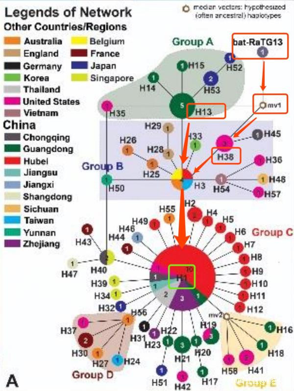 具體來説,這58種單倍型其中被分為5組。其中三個中心單倍型為H1、H3、H13,分別為A組、B組、C組,這三種單倍型被認為是古老超級傳播者。D組和E組的中心分別是兩種新的超級傳播者單倍型,即H56和mv2。