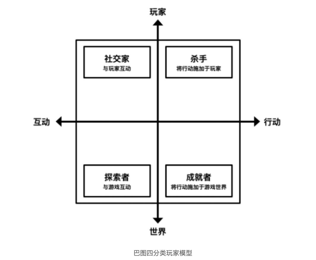 遊戲《多使用者迷宮(Multi-User Dungeon,MUD)》的聯合創始人理查德-巴圖(Richard Bartle)在通過觀察和分析人們在多用户遊戲中的行為,按照遊戲風格和興趣,將玩家分為四種類型,每種類型都有一個生動的名稱: