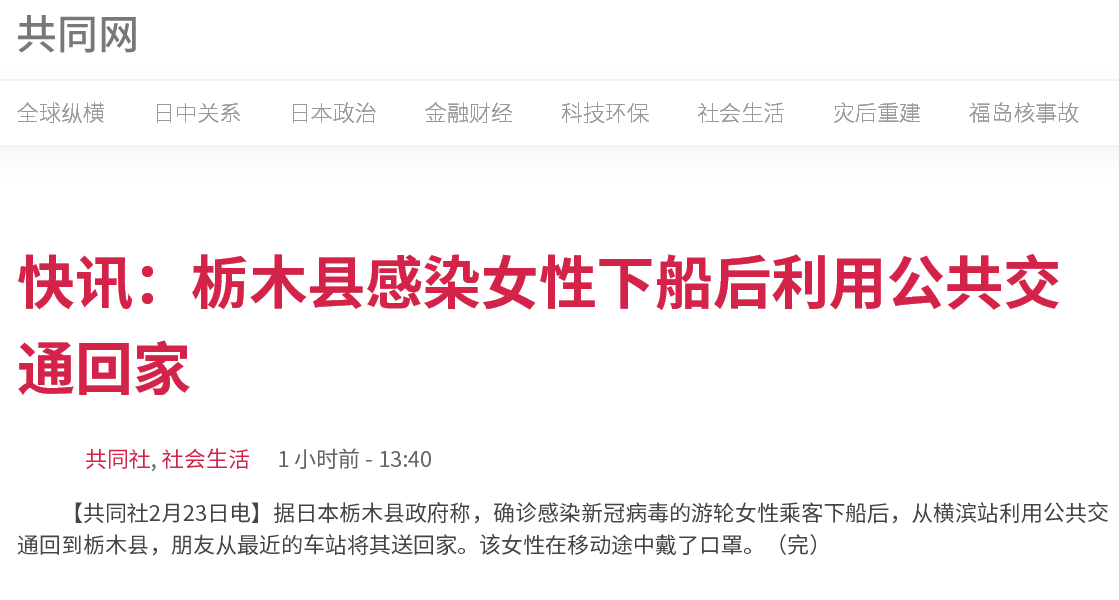 據日本栃木縣政府稱,確診感染新冠病毒的郵輪女性乘客下船後,從橫濱站利用公共交通回到栃木縣,朋友從最近的車站將其送回家。不過,共同社報道表示,該女性在移動途中戴了口罩。日本厚生勞動省稱,栃木縣60多歲女性是從“鑽石公主”號郵輪下船的日本人乘客中首個確診感染新冠肺炎的病例。
