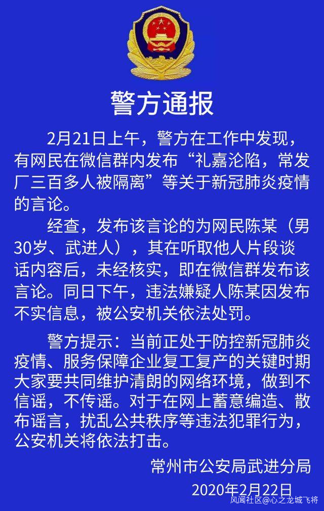 22人蔘與9評論2月21日上午,江蘇常州有一網民在微信羣內發佈“禮嘉淪陷,常發廠三百多人被隔離”的虛假言論,江蘇常州武進警方迅速展開調查,2小時內就將嫌疑人陳某抓獲。