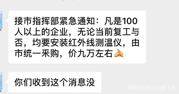 此前,一則“緊急通知”當天在網絡流傳,該通知稱,“接仙桃市指揮部緊急通知,凡是100人以上的企業,無論當前復工與否,均要安裝紅外線測温儀,由市統一採購,價格9萬左右”。