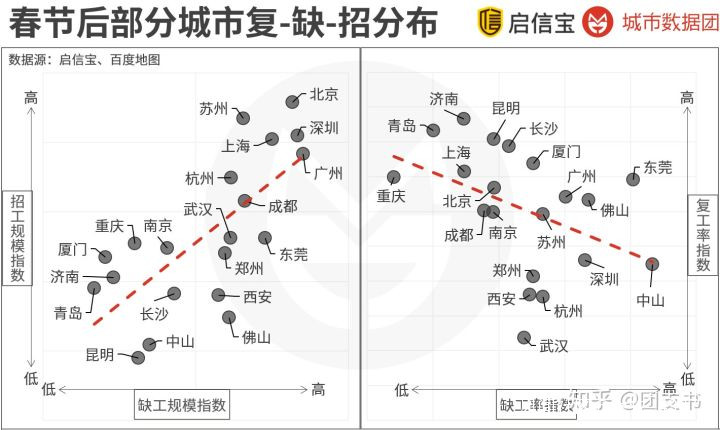 右上角:缺工率高、招工率也高;包括以廣州、杭州、深圳為代表的一線與準一線城市,它們面臨的缺工困難較大,但恢復的意願和信心也都非常強。左下角:缺工率低、招工率也低;包括青島、濟南、昆明等城市,其勞動力缺失情況不嚴重,而相應地,招工意願也較為一般。右下角:缺工率高,招工率低;以中山和佛山為代表的城市裏,企業似乎招聘意願不強,這是值得我們關注的現象與地區。左上角:缺工率低,招工率高;北京上海成都都是這一類城市,其實已經有大量的勞動力返回了,困難不是那麼嚴重,但這些城市的企業仍然希望能夠進一步擴大招聘規模,表現出較強的信心。當然,城市的“招工”態度不同,可能跟城市的產業結構有一定關聯。比如傳統制造業可能在疫情前就在若干地區出現了問題。