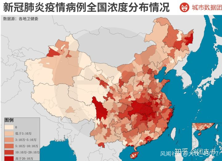 這張圖乍看之下似乎規律並不明顯。但如果我們把這張圖與下面這張“病例濃度圖”(新冠肺炎確診人數/常住人口數)進行比較,將會發現二者有很強的空間互斥性。