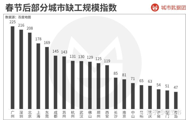 可以看到,缺工規模最大的四個城市正好是四個一線城市;其中,對外來勞動力依賴程度較高的廣深更是嚴重的地區。