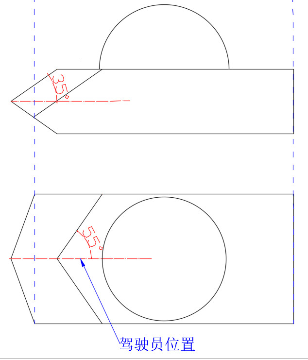 於是一種解決方法就是將首上做成兩個維度的傾斜,比如與水平面成35度夾角、與車身側面呈55度夾角。這樣就為駕駛員騰出了空間,而正對時卻相當於與水平面夾角arcsin(1÷sin(35度)÷sin(55度))=28度的裝甲。