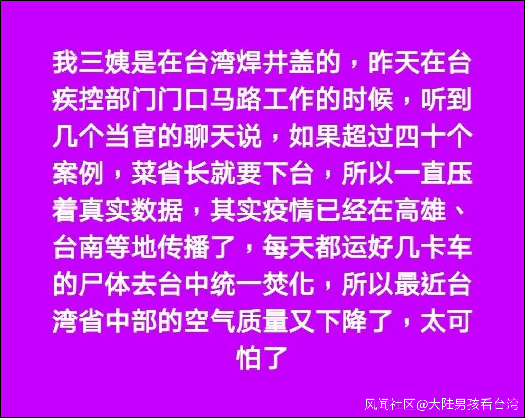 我三姨是在台灣焊井蓋的,昨天在台疾控部門門口馬路工作的時候,聽到幾個當官的聊天説,如果超過四十個案例,菜省長就要下台,所以一直壓着真實數據,其實疫情已經在高雄、台南等地傳播了,每天都運好幾卡車的屍體去台中統一焚化,所以最近台灣省中部的空氣質量又下降了,太可怕了。