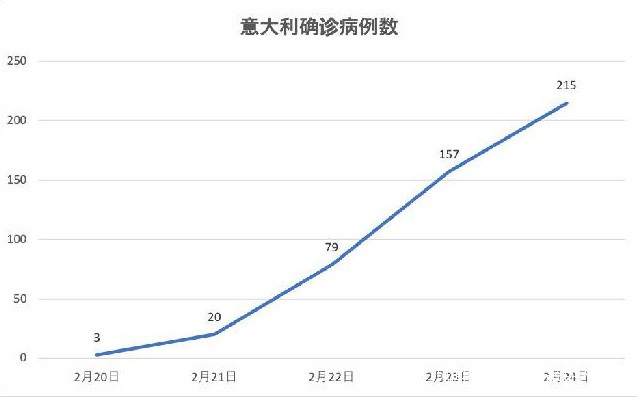 截至2月24日,意大利累計確診新冠病毒感染病例215例,死亡病例4例。確診病例從3例增加至215例,意大利只經歷了4天。
