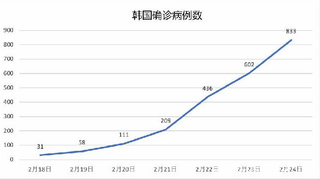 2月19日,韓國確診病例達58例;2月20日,確診數達111例;2月21日,確診數達209例;2月22日,確診數達436例;2月23日,確診數達602例;2月24日,確診數達833例。