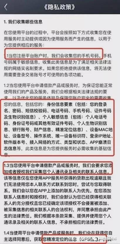 查看飛貸的《隱私政策》發現,飛貸APP想要獲取的信息可謂五花八門,既包括手機號碼、身份信息、個人生物識別信息、個人敏感信息、銀行賬户、財產信息、精準定位信息,還包含設備的MAC地址、設備型號、操作系統、識別符、登錄IP等等。值得注意的是,飛貸APP還要求獲取通訊錄及相關的聯繫人信息,用於貸款逾期的催收。