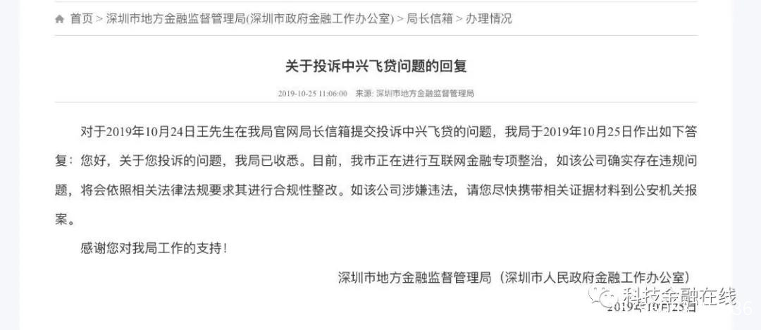 在深圳市地方金融監督管理局網站上,也有多起投訴中興飛貸的信息。深圳地方金融監管局表示,如該公司涉嫌違法,建議投訴人攜帶相關證據材料到公安機關報案。
