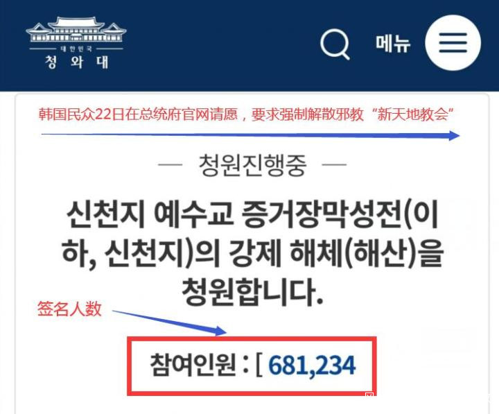 對策本部表示,新天地信徒總計21.5萬人,這可能不是最終數據,準信徒不會列入信徒名單。68萬民眾請願,要求強制解散“新天地教會”2月22日,韓國民眾在總統府青瓦台網站發起請願,要求政府強制解散“新天地教會”。民眾將疫情失控歸咎於該教會歪曲的教義。目前已有超過68萬人簽名。