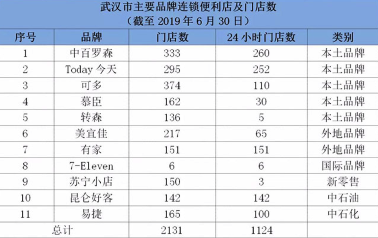 如今,武漢市共有便利店品牌20餘個,便利店門店數約3500家。其中,品牌連鎖便利店11個,門店總數2131家,平均1家店覆蓋近5200個常住人口,覆蓋率優於全國水平。