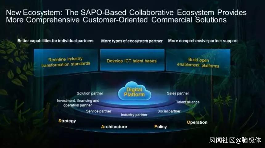 另一方面,在包羅萬象的智能化場景中,任何一家企業都不可能滿足所有的長尾需求。所以在未來十年,華為必然加深生態合作體系,通過合作打造面向客户完整的商業解決方案的新生態。為此,華為企業BG提出了SAPO模型,即基於企業的業務戰略、架構、策劃以及運營的生態構建方法論,由銷售、解決方案、服務、投融資運營、人才聯盟、社會和產業等7類主要夥伴組成的新生態,呈現一專多能、深度融合的新生態形態。