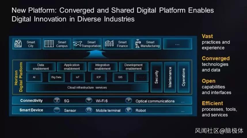 以沃土數字平台為代表,華為正在打造一個融合共享的數字平台,它是使能行業數字化轉型的關鍵。新平台融合了華為自身數字化轉型的實踐、與客户和合作夥伴共同得到的行業智慧,以及雲計算、大數據、IoT、融合通信、GIS等多種新ICT技術的底層融合。基於沃土數字平台的產業模式,各種新技術可以通過組件化靈活部署,從而降低新技術使用的門檻,使各行業用户在數字化轉型過程中能夠專注於自身優勢的發揮與業務創新,低門檻獲得新ICT計算的支持。