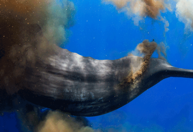 這是一組2014年3月在加勒比海多米尼加西海岸附近拍攝的照片。據攝影師wilk説:“它釋放出糞便之後,便開始在水中上下襬動,用尾巴甩得海水四處飛濺,基本上使糞便儘可能掩藏自己。”排便完成後,鯨魚便遊向大海深處。這看起來像是為了自我防衞。“儘管這次拍攝經歷非常不可思議、令人作嘔(攝影師眼睛、嘴巴、潛水服裏都是鯨魚大便),但確實很榮幸能遇到這樣的事情……這確實是一次非常奇妙的經歷。”