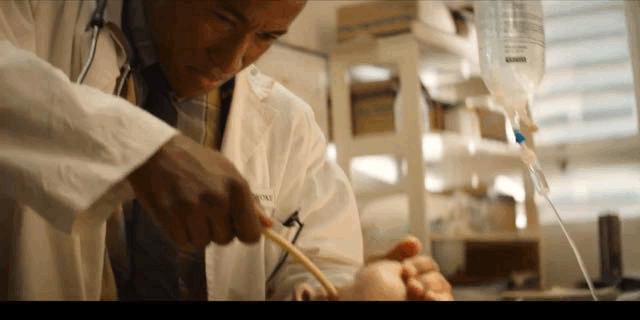 為了幫助恢復呼吸,醫生利用呼吸管伸向他的嗓子眼。