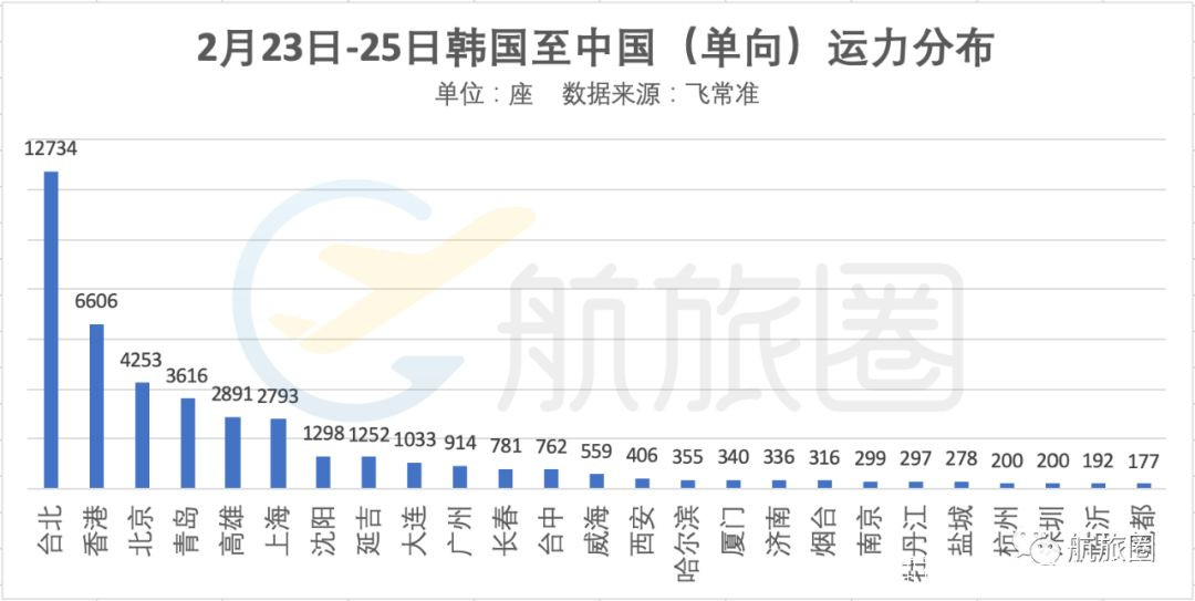 同時,根據飛常準韓國到中國各城市的可用座位數數據,航旅圈也梳理出23日到25日韓國人最可能去往的中國城市,其中台北,香港,北京,青島,高雄,上海排在前六位。
