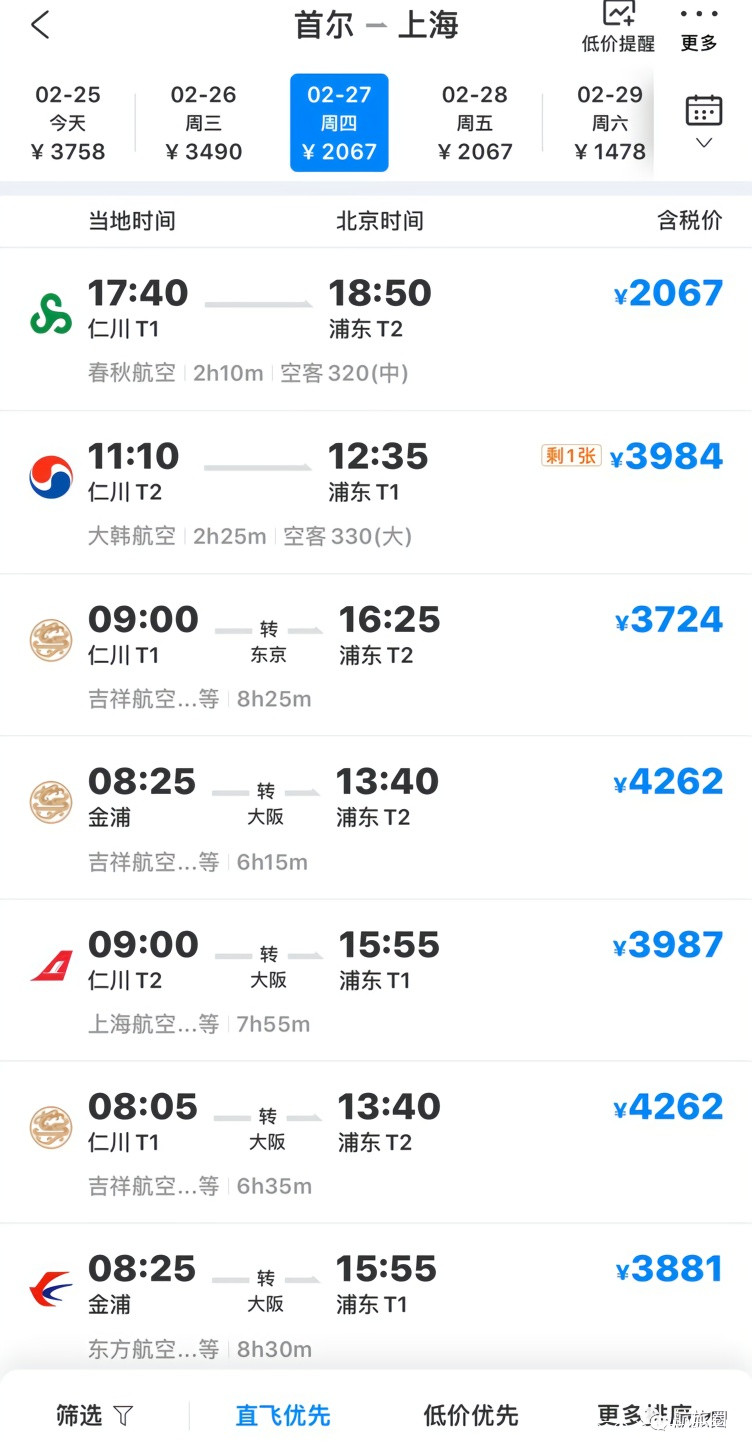 比如2月27日首爾飛上海的航班,直飛最低的經濟艙價格是春秋航空的2067元,另外還有大韓航空的3984元,並且只剩一張機票,其他航班都是轉機航班,價格更是高達三四千元,而此前該航班機票一度低至千元以內。