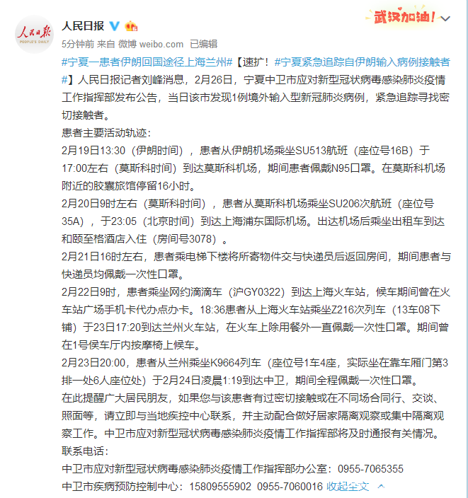 人民日報記者劉峯消息,2月26日,寧夏中衞市應對新型冠狀病毒感染肺炎疫情工作指揮部發布公告,當日該市發現1例境外輸入型新冠肺炎病例,緊急追蹤尋找密切接觸者。