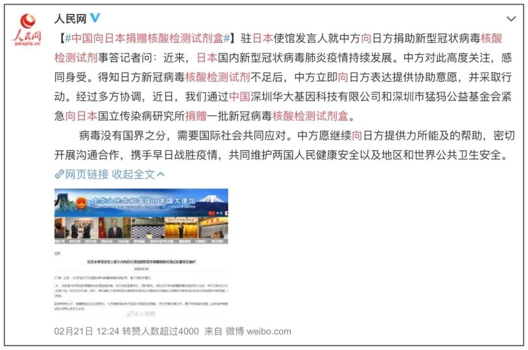 對於日本新冠病毒的發展形勢, 中國又向日方捐贈了核酸檢測試劑盒……