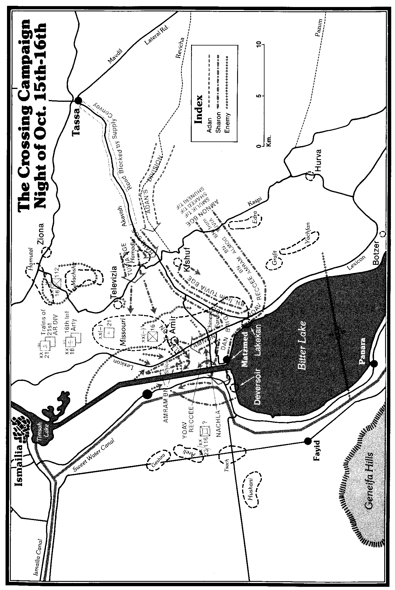 阿姆農旅部署在卡斯派公路上,在基舒夫以南。偵察隊在前面探路,然後是三個坦克營跟進,最後是三個步兵營。在暗夜掩護下,阿姆農旅開始從卡斯派公路56公里處向埃軍結合部出發了,從這裏一直到大苦湖依然沒有埃軍駐守。他們達到萊克希肯公路的時候轉向北方,繞過拉基坎。尤阿夫·布羅姆的偵察隊擔任引導,他有大約20輛坦克和20輛裝甲運兵車。這支部隊按照計劃在納哈拉、提爾圖爾和希克公路三條軸線上向西轉,順利抵達運河邊,形成3公里寬的陣地。馬上到達的是阿姆農的一個營,有22輛坦克,另有阿姆農的前進指揮部。部隊繼續前進,抵達希克公路,也沒有遇到任何問題。在希克公路上,他們轉向西北,奪過埃軍在米弗拉斯的渡河點,並控制了橋頭堡。接下來是阿爾莫格的營,有21輛坦克。他們的任務是在希克公路上在中國農場以北的地方向東轉,回師從背後向密蘇里進逼。最後一個坦克營就是從圖維亞旅調撥過來的。兩個連用來從西向東打通阿卡維什和提爾圖爾公路。第三個連一分為二,用來加強跟進的兩個步兵營,4輛坦克加強什穆利克的營,另外5輛坦克加強沙基德的不滿員偵察隊。按計劃,什穆利克營要跟在阿爾莫格營的後面,掃清阿米爾和密蘇里;沙基德的部隊則掃清萊克希肯公路以西地區。最後是傘兵,由舒耐裏少校指揮,他們得到反坦克武器的加強,將留在拉基坎附近,對作戰區域提供南翼警戒,另外這也是阿姆農的預備隊。