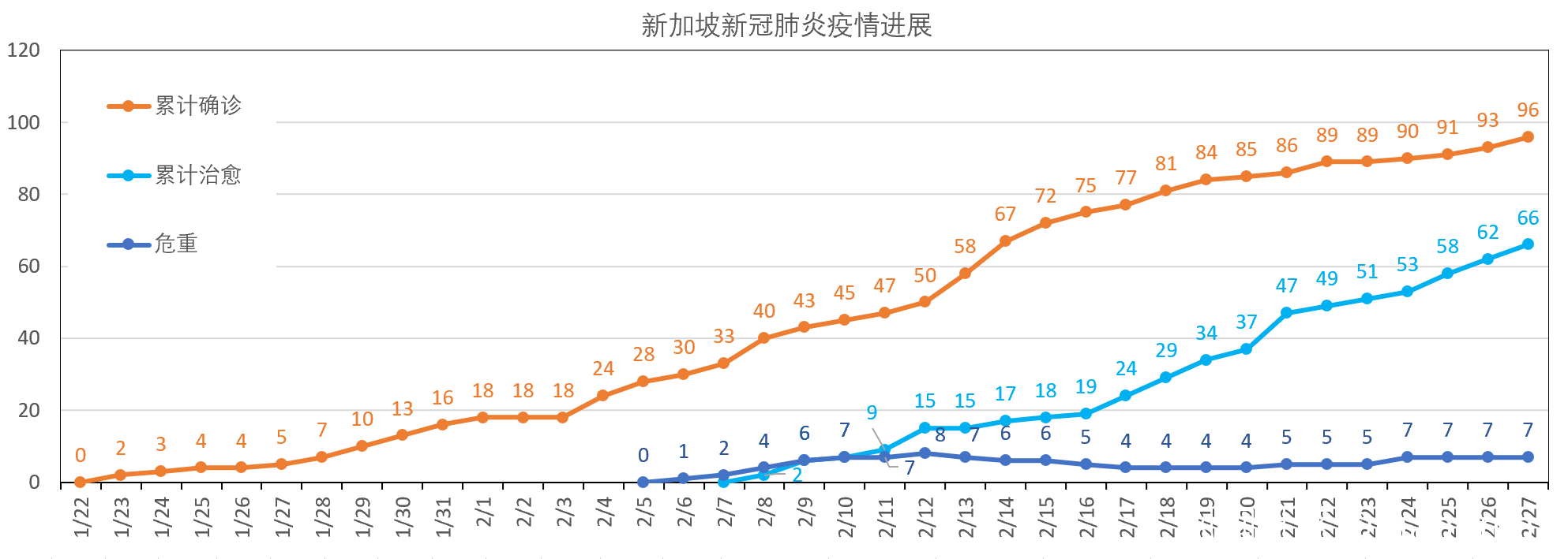 第五名新加坡:今天新增3例,累計96例。新增出院4例,累計出院66例,目前住院病例30例,其中重症7例。