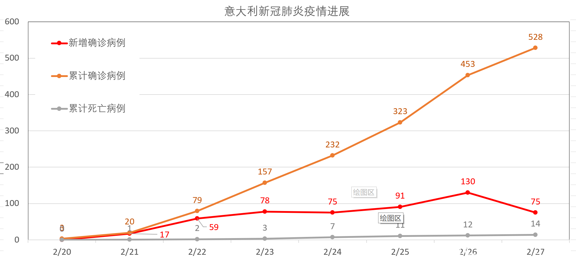 第三名意大利:疫情繼續發展, 截止當地時間26日12點,又新增75例,累計確診528例;病亡增加2例,累計14例,病亡率高達2.7%。為了防止疫情擴散,當地政府已經下令對多個城鎮進行封鎖。考慮到意大利是申根協定國家,周邊國家的外溢病例已經開始出現,歐洲的抗疫形勢不容樂觀。