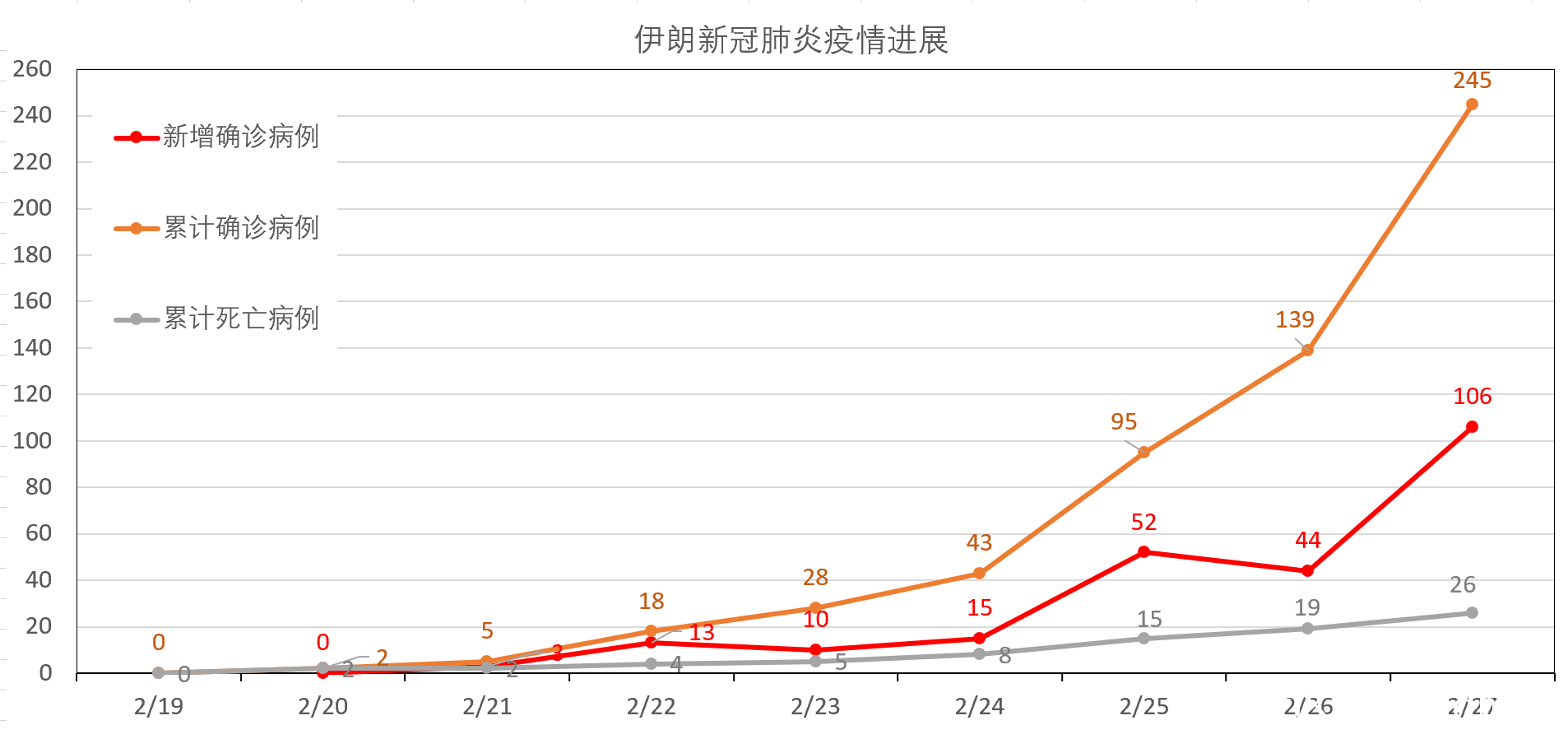 第四名伊朗:截止27日,新增確診病例環比增加了140%,達到了106例,累計245例;新增死亡病例7例,累計26例,病亡率高達10.6%,為全球最高。伊朗的多位高官,如副總統、衞生部副部長、議會國家安全委員會主席均傳出感染新冠肺炎的消息,由此可見伊朗疫情處於大流行階段。