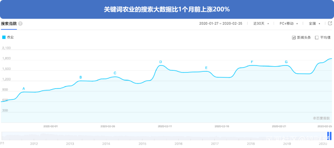 通過在搜索大數據中以“農業”為關鍵詞進行搜索,可以看到整個搜索趨勢曲線自1月25日之後是穩步增長的。或許正是因為人們對於農業的關注度極具上升,中央也將目光放到了受疫情影響的農業上。