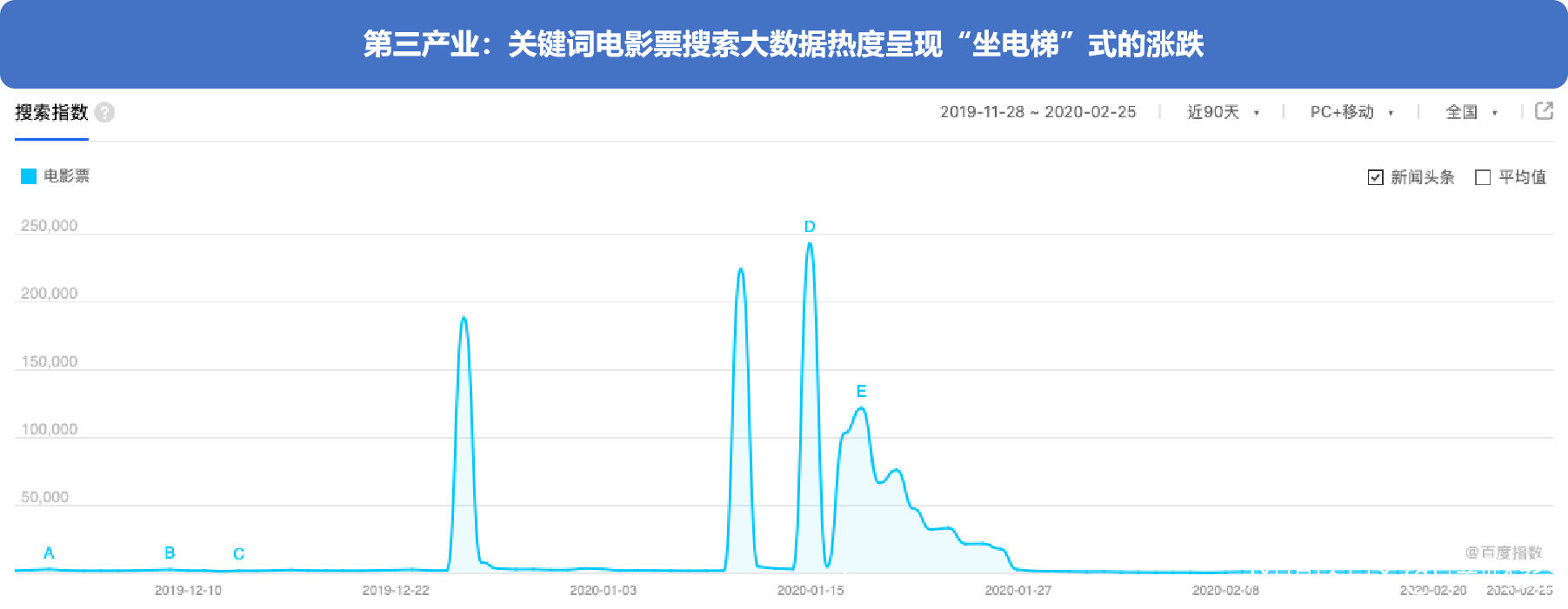 對於以電影行業為代表的第三產業來説,經濟遭受的影響是巨大的。春節檔正是大賺一筆的時候,但正因為此次疫情的發生,各地政府嚴令禁止電影院等場所開業,讓整個行業落入冰窖。並且,通過這個搜索大數據可以直觀地看出疫情對於電影行業的衝擊相當大。