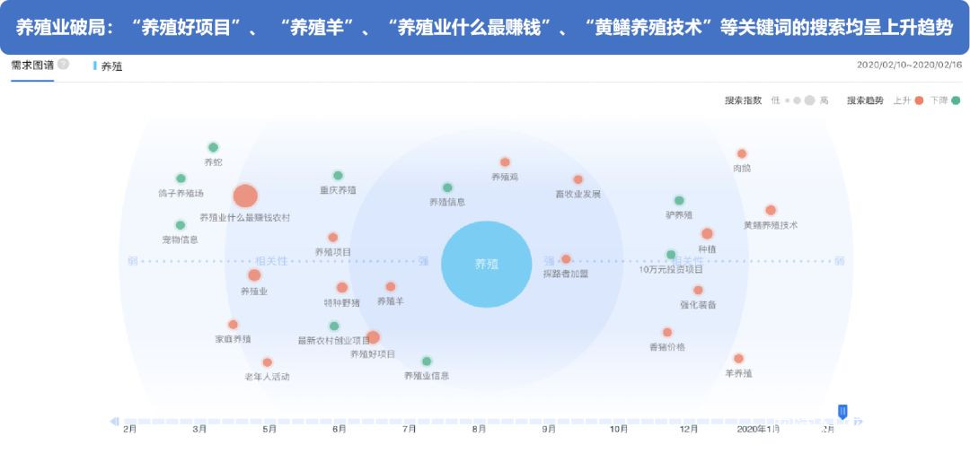 “養殖”、“種植”等關鍵詞在穩步上升的同時,養殖業可能率先破局,從搜索大數據可以看到,網友對於養殖技術和養殖品類的關注度在逐漸回暖。