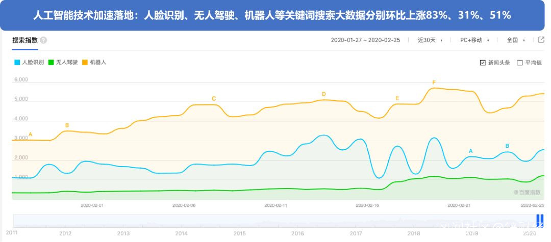 “機器人”、“人臉識別”和“無人駕駛”三個關鍵詞的搜索熱度分別環比增長51%、83%、31%,人工智能在抗疫第一線發揮了巨大作用,有效減少了人與人之間的接觸,降低了疫情擴散的概率。搜索熱度的暴增意味着更多的社會關注,人工智能的價值被更多的人認識和認可。