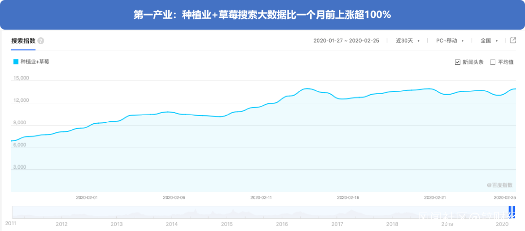 最後是以農業為主的第一產業經濟,在春節後也基本上呈現着穩步上升的趨勢,根據搜索大數據以“種植業”為關鍵詞搜索和以“草莓”子類目作為關鍵詞進行搜索也可以印證這一點。