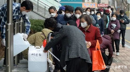 2月26日,在韓國全州,市民排隊接取政府提供的消毒液。新華社/紐西斯通訊社