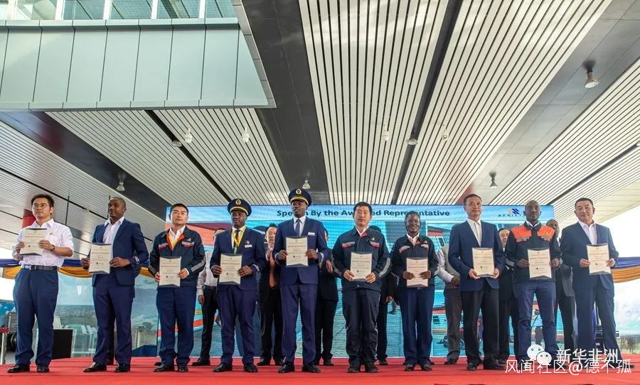 2月25日,在肯尼亞首都內羅畢舉行的蒙內鐵路安全運營1000天表彰會上,獲得“安全衞士”稱號的蒙內鐵路員工在台上合影。新華社記者 張宇攝