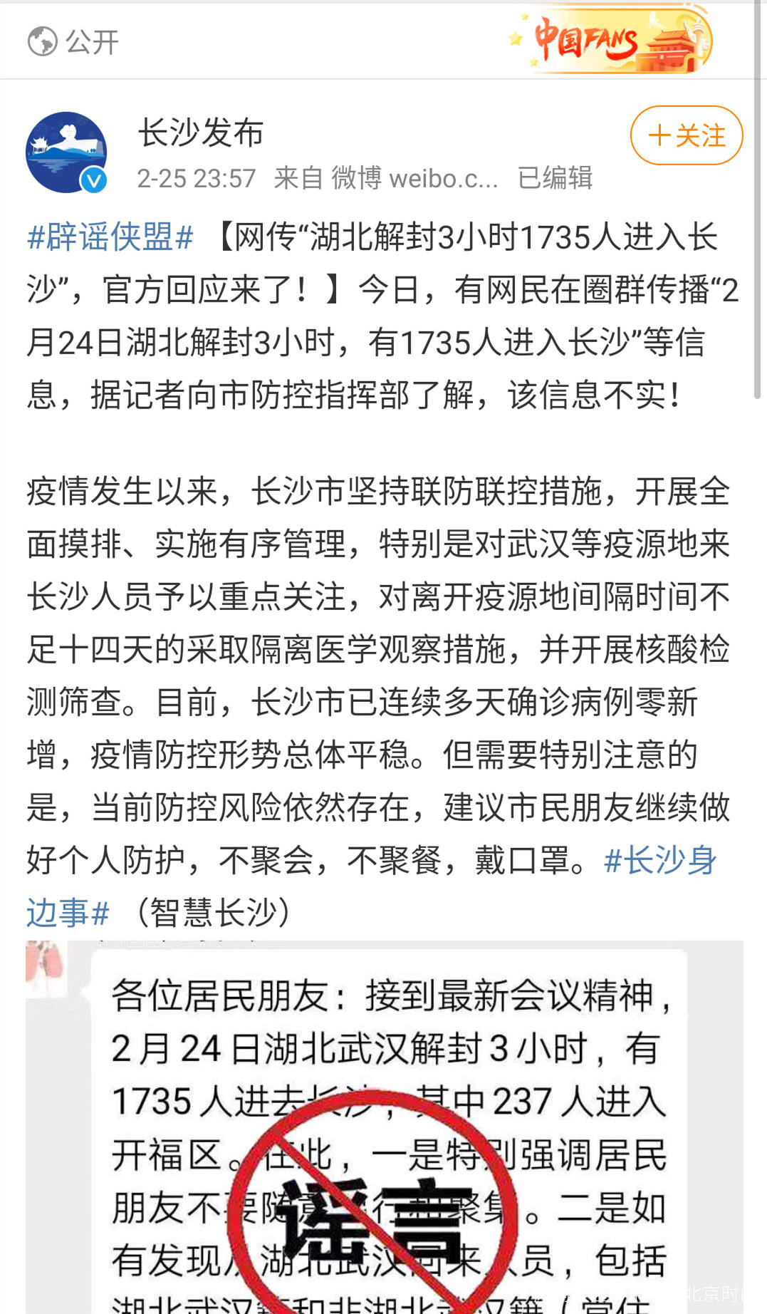 此外,在一張轉發量較大的微信截圖上,紅星新聞看到備註名為社區工作人員的微信用户發文稱,“2月24日湖北武漢解封3小時,有1735人進去長沙,其中237人進入開福區。”但該消息很快被長沙市委網信辦官方微博@長沙發布 發文稱信息不實。