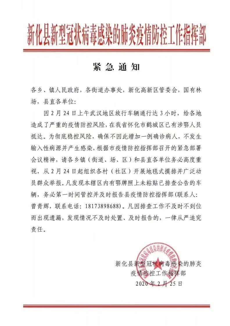 在一份落款為“新化縣(注:湖南省婁底市屬縣)新型冠狀病毒感染的肺炎疫情防控指揮部”的緊急通知上,該縣稱因2月24日上午武漢地區放行車輛通行達3小時,相鄰地區懷化市鶴城區已有涉鄂人員抵達,為徹底穩控風險,將在全縣開展地毯式摸排清查。