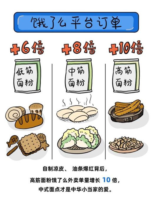 在餓了麼上,高筋麪粉外賣單量增長10倍,中筋麪粉增長8倍,低筋麪粉增長6倍。