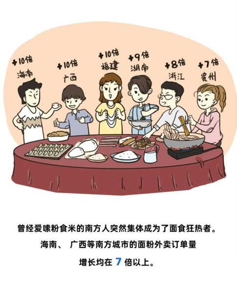 但同時, 曾經嗦粉食米的南方人突然也集體成為了麪食狂熱者:海南、廣西等南方城市的麪粉外賣訂單量增長均在7倍以上。