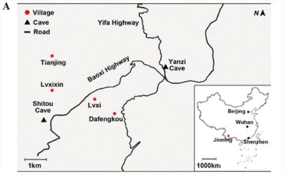 為進行人類感染蝙蝠SARS相關冠狀病毒的血清檢測,在2015年10月,石正麗團隊在雲南省昆明市晉寧區夕陽彝族鄉4個村莊(天井,大風口,綠溪,綠溪新村)收集了218個居民的血清樣本。附近有2個蝙蝠洞(燕子洞和石頭洞),距離4個村莊在1.1-6.0公里之間。自2011年以來,石正麗團隊一直在對這些洞穴中存在冠狀病毒的蝙蝠進行縱向分子監視,並發現大量蝙蝠居住,包括被證明是SARS相關病毒主要宿主的菊頭蝠(石正麗團隊日前發現的與新冠病毒最接近的病毒樣本,也採自菊頭蝠)。