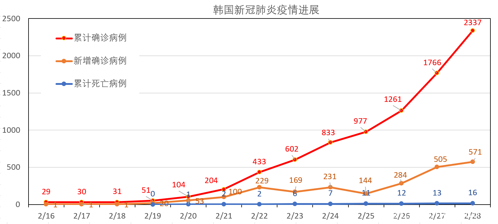 第一名韓國:28日的新增確診病例又破紀錄,達到了571例,累計確診2377例,已經超過我國除湖北所有省份的病例數;病亡增加3例,累計16例,病亡率為0.7%。鑑於韓國、日本疫情的快速發展,我國部分邊境口岸已經對來自兩國的入境人員實行集中隔離措施,中國政府也正在向韓國政府提供援助。世界多國也將韓國列入了疫區。